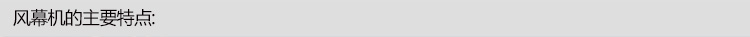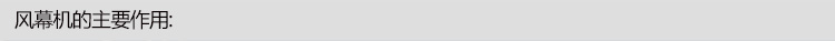 風幕機是通過風輪的轉動產生的強大氣流,送出一定速度和溫度的幕狀氣流,形成一面無形的門簾。該機安裝在制冷、空調、防塵、隔熱的商場、劇院、賓館、飯店、會議廳、冷藏庫、手術室及家居等門口上方,啟動該機,能把室內外的空氣隔開,起到即出人方便,又能防止室內外冷熱空氣交換,保持室內溫度的恒定,同時還可阻擋灰塵、昆蟲的進入及有害氣體、異味的擴散.
